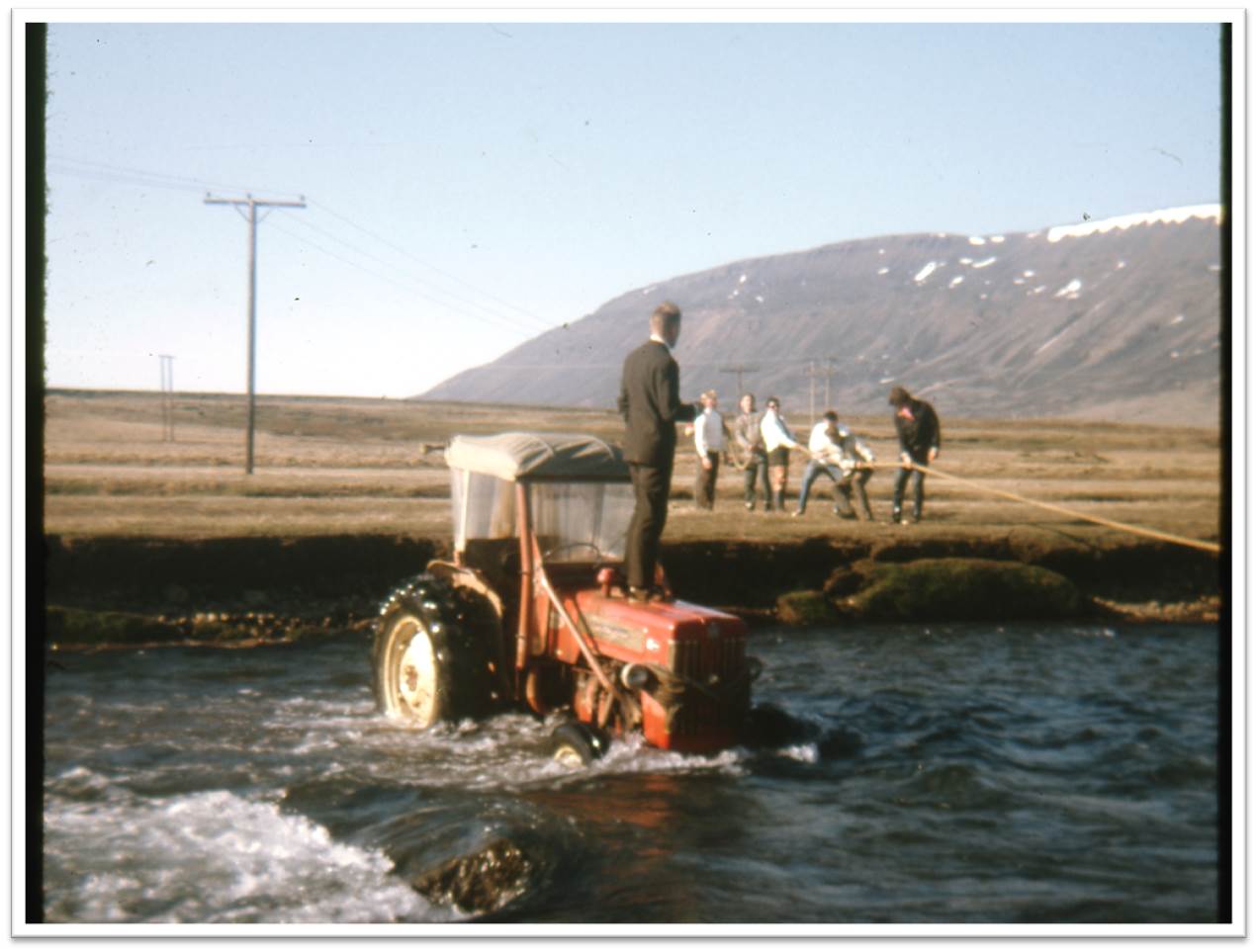 Það var mikil keppni milli landmanna og sjómanna í gamladaga og þá var reipitogið alltaf yfir ána, Gussi Balda var oft fenginn til þess að dæma hvort liðið hefði betur þarna stendur hann upp á traktornum og gefur merki.
