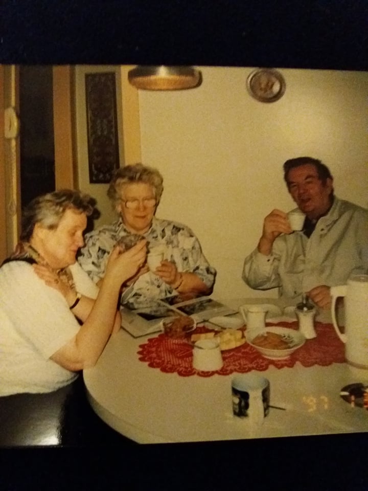 Kaffispjall við eldhúsborðið í Ásbyrgi Bettý, Bubba og Bjössi á Grund.