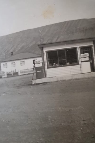 Svona leit Esso shjoppan út þegar ég var unglingur hún stóð eins og sjá má rétt norðan við Kaupfélagið, beit á móti henni stóð Shjell shjoppa sem Jóhann Eiríksson átti (karlinn var betur þekktur sem Jói Eiríks)
