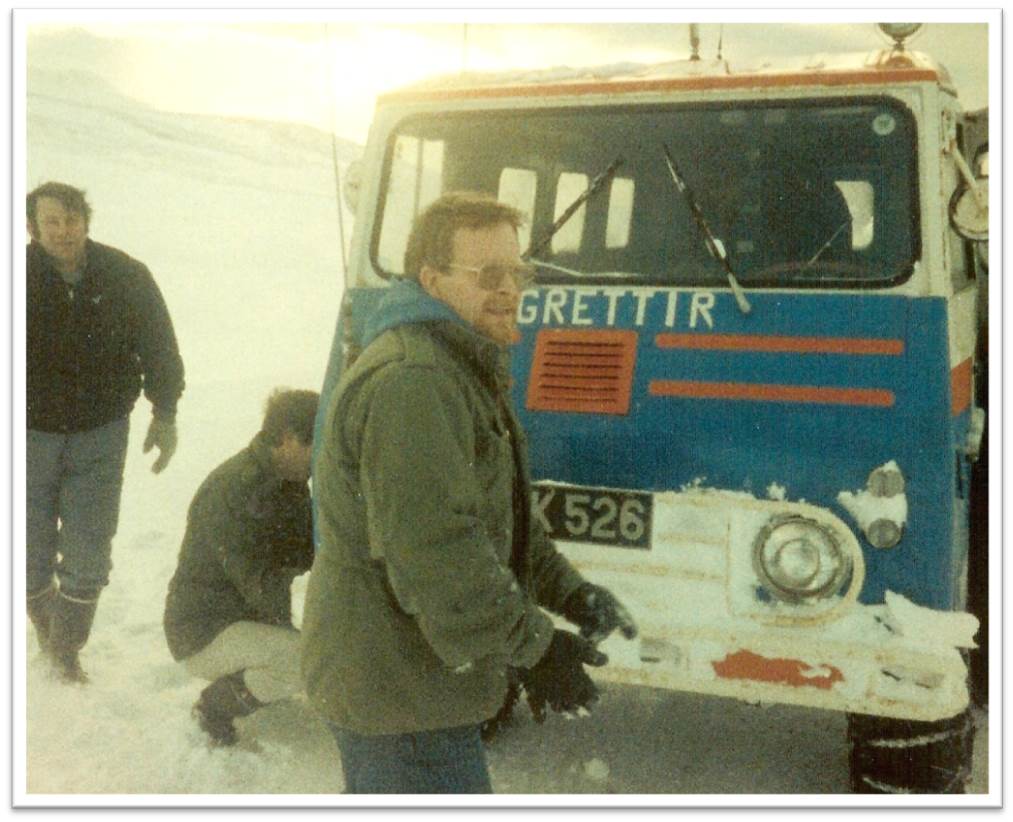 Þessi mynd er tekin í frægri Ísbjarnaferð með sjónvarpsmenn út í Haganesvík þegar ísbjörn kom þar á land, Bjössi í Langhúsum skaut dýrið, mikið gekk á við að koma fréttamyndum suður Ómar Ragnarsson festi flugvél í krapa á Höfðavatni þegar hann ætlaði að lenda á ísnum til þess að sækja myndir fyrir fréttastofu rúv.