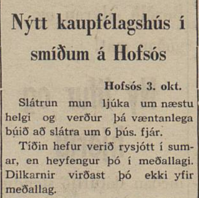 Frétt frá 1955 Nýtt kaupfélag, slátrun að ljúka, heyfengur og dilkar í meðallagi. Allt fínar fréttir.
