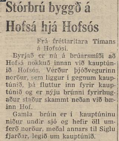 Það varð mikil breiting að fá brúna yfir Hofsá neðan við Hof sem byrjað var að byggja 1956 rétt innan við þorpið er í fréttinni, segjum við ekki rétt ofan við? samt fór umferðin í gegnum þorpið og í beyjunni við Shéll shjoppuna hjá Jóa Eiríks var vegaskilti, þar stóð Haganesvík 33 Áður en brúin við Hof kom hefur verið tafsamt að fara niður í stað og upp ytri sneiðinginn og þá leið til Siglufjarðar, rúturnar eða langferðabílarnir eins og þeir voru kallaðir stoppuðu að vísu alltaf við Hótelið niður í stað. Það er vest að ungafólkið fæst varla til þess að virða þessi gömlu staðarheiti.