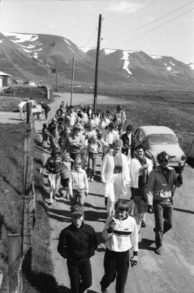 Hátíðarhöld á 17. júní ártal vantar, ef einhver veit það þá er ummæla gluggi neðan við myndina. gaman væri líka ef einhverjir geta borið kennsl á einhverja af þorpsbúunum á myndinni.
