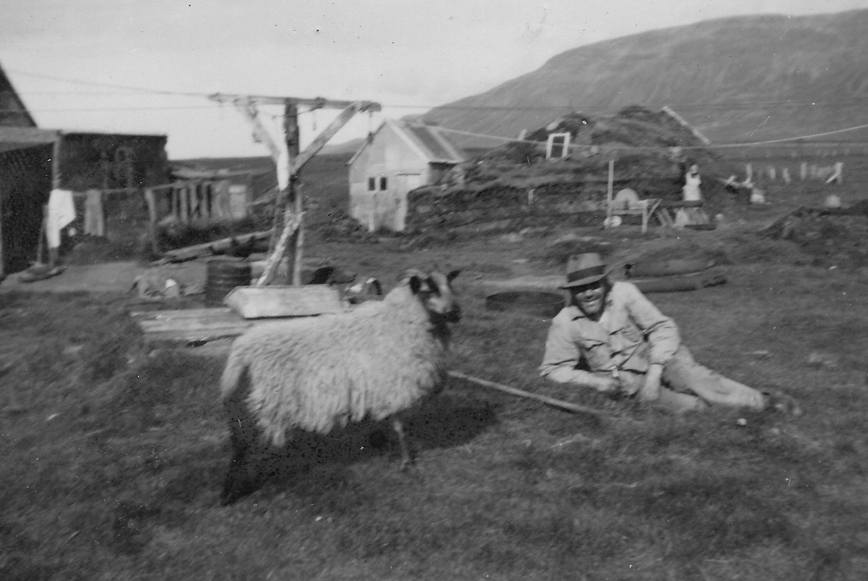 Hér má sjá Kristján Guðmundsson / Stjána í Berlín og ef þið stækkið myndina má sjá konu með hvíta svuntu, þetta var klæðnaður kvenna hvort sem er að ræða bædakonur eða vinnukonur. Einnig má sjá skúrinn sem hýsti rafstöðina í Berlín.