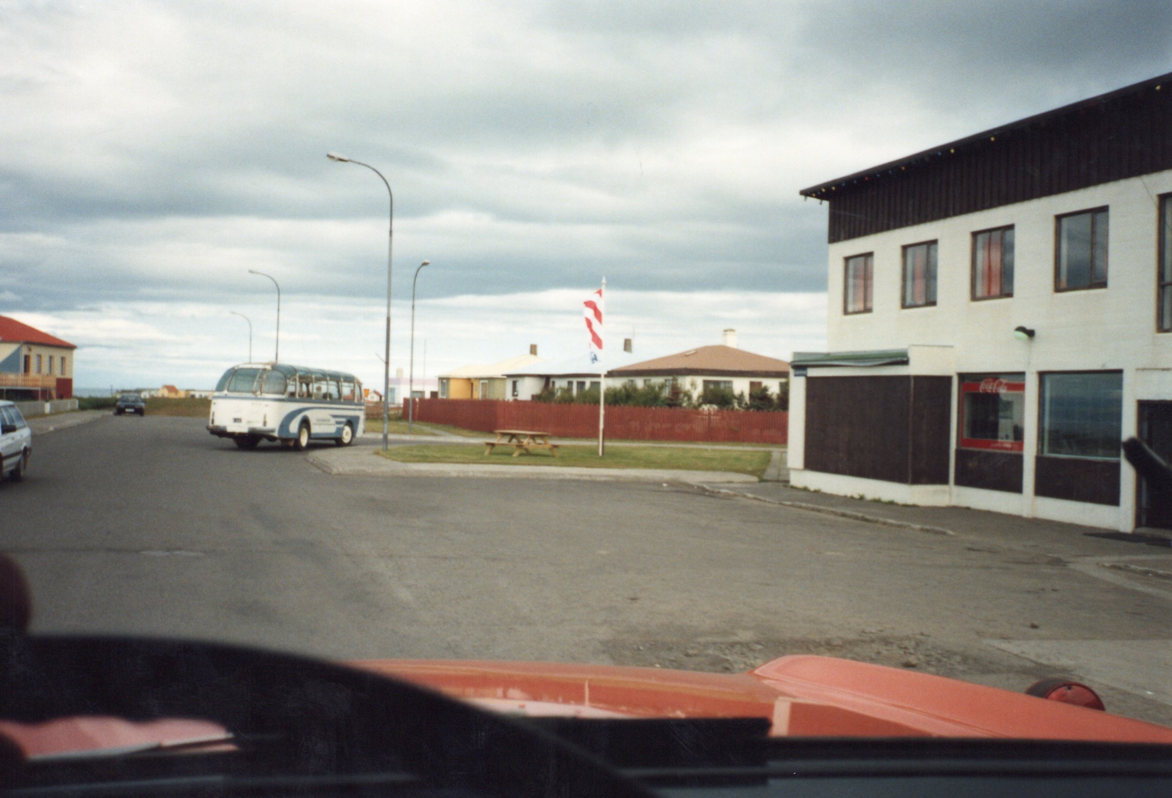 Gamli K 550 á gatnamótum þar sem stóðu tvær bensínstöðvar í gamla þorpinu sitthvorumegin við veginn Esso og Shéll í beiunni var skilti sem stóð á Haganesvík 33