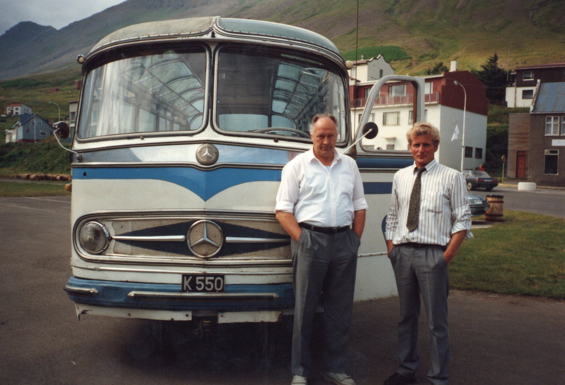 Gamlir siglfirðingar komnir að sjá gömlu rútuna sem gekk milli Siglufjarðar og Reykjavíkur. Þarna er Ninni á Hring með Gunna í Stóragerði