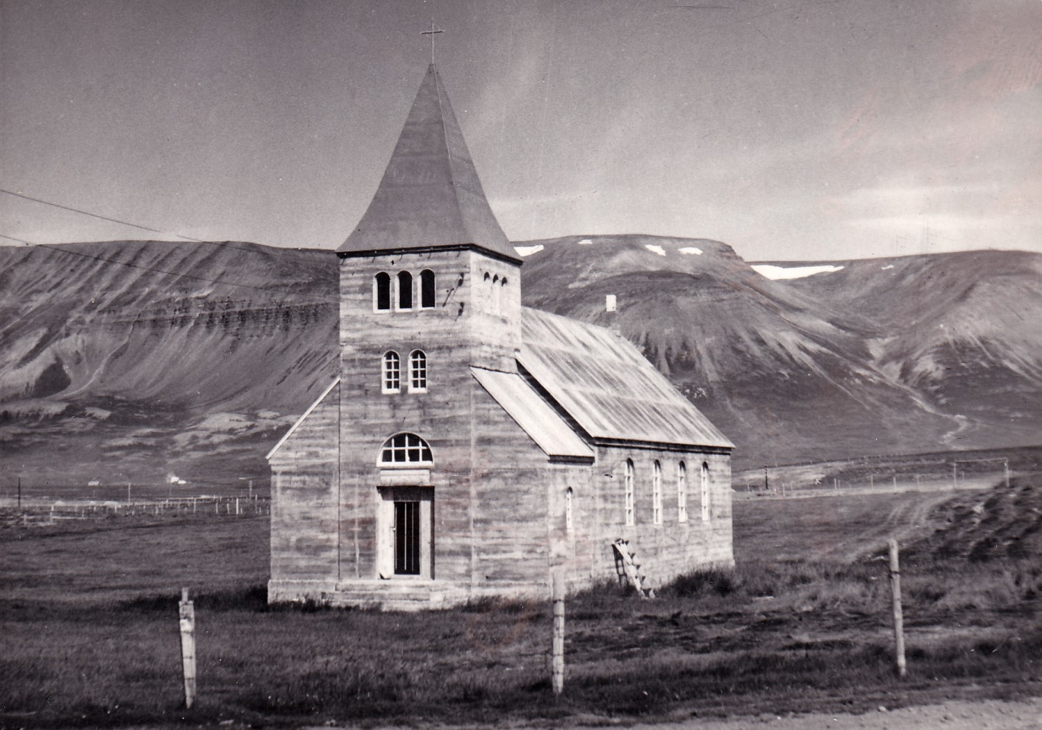Þessi mynd er möguð ef kirkjan er vígð 1960 þá hefur byggð verið frekar lítil allavegana eru engin hús í Kirkjugötu, Sætúni eða Hátúni en íbúum hefur / þorpurum hefur fjölgað í kirkjgarðinum, allavegana eru veggur og hlið kirkjugarðssins eru ekki komin þegar þessi mynd er tekin.