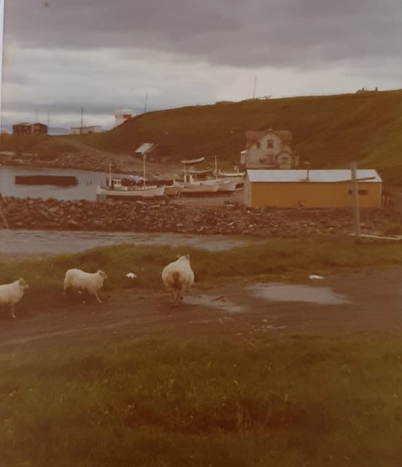 Svona var þetta hérna í þorpinu, kindur út um allt, enda áttu margir fjárhús upp í fjósahverfi, á þessu árum þýddi ekkert að eiga fallegan blómagarð, kindurnar sáu um að grisja lóðirnar. Sjá breitinguna grasið hefur vikið fyrir malbikinu.