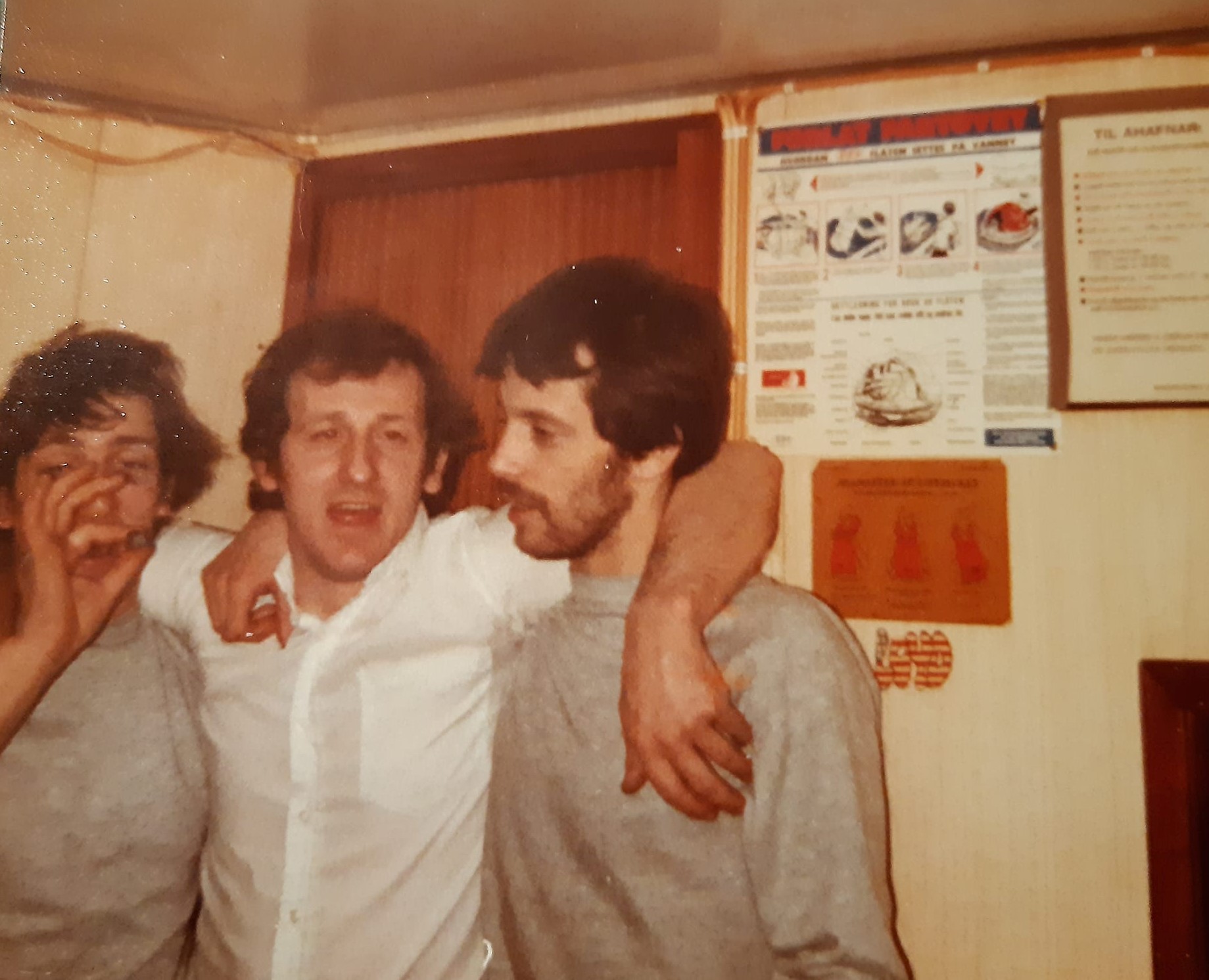 Þessi er tekin um borð í Skafta SK 3 þarna eru þrír gamlir þorparar Guðmundur Árnason (Muggur) Sigurður Péturson (Siggi Tása) og Jón Geirmundsson.