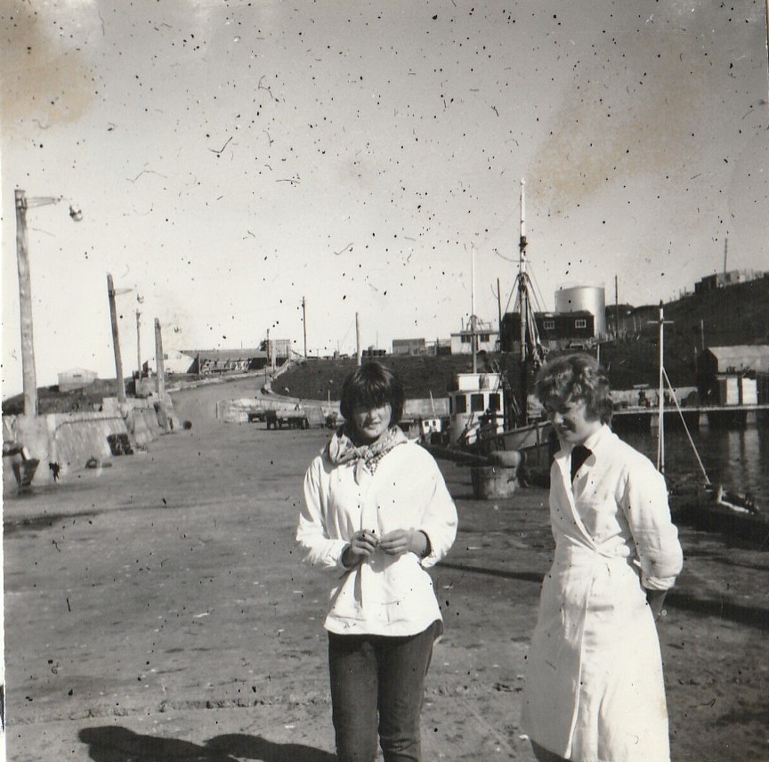 Hérna sjáum við eina mynd sem er algjör gullmoli sem Villi Geirmundar tók, sagan segir að stelpurnar Helga og Anna Steina hafi verið að vinna á frystihúsinu og hafi notað kaffitímann til að skreppa á bryggjuna til að kíkja á sætu sjóarana á einhverjum bátnum. Það fylgdi sögunni að þær hafi verið nokkuð skotnar í strákunum.