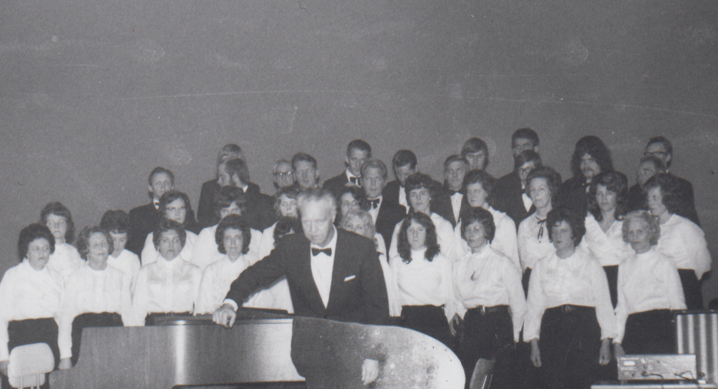 Söngfélagið Harpa átti stóra sviðið í félagsheimilinu Skildi á vígsludegi 1974 hér held ég að sé full mæting hjá kórnum. Kannski vantar einhver nöfn á listann hér við hlið, þau yrðu vel þegin ef einhver áttar sig á því.