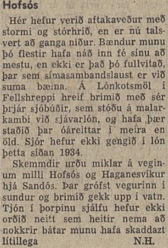 Þetta hefur verið mikið óveður með hafróti, en hver ættli hafi verið fréttaritari þegar þetta var skrifað? N.H. kannski Níels Hermannsson.