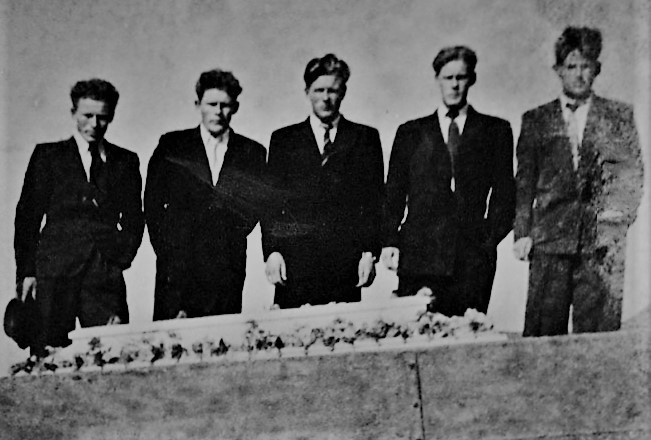 Hér er mynd af bræðrunum á Vatni við kistu föður þeirra Þorsteins Helgason 1952