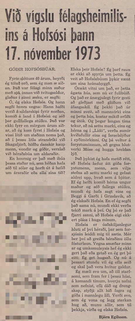 Ó, ég elska Hofsós. Þetta er svo satt og líka svo fallegt? sjómaður tekur land í þorpinu og sér gullfallega stúlku, á vígslu félagsheimilissins talar Björn Egilsson um ungan sjómann félagasinn suður með sjó sem átti þessi yndislegu orð um þorpið okkar, sennilega hefur þessi gullfallega stúlka hjálpað til.