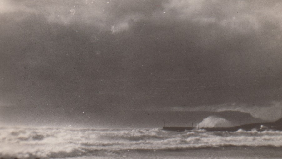Önnur mynd af sw roki, við þessar aðstæður reyndu menn samt að gera út frá Hofsósi, við fyrstu sýn þá er ekkert að sjá mema brim og rok, þegar myndin er stækkuð þá sést að einn bátur liggur við bryggjuna stefni, stýrishús og möstrin á bátum sjást, þetta er sennilega Frosti eldri seinna Berghildur SK 137