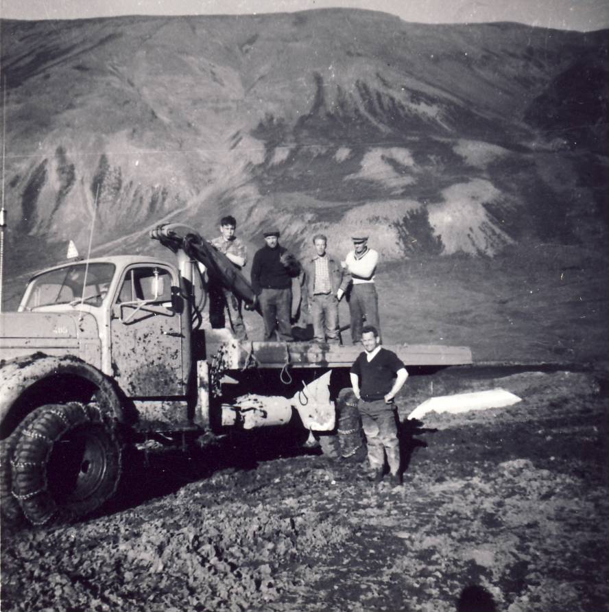 Mennirnir á pallinum talið frá vinstri, Gísli Víðir Björnsson frá Framnesi, Gestur Pálsson frá Bergstöðum í Svartárdal Hún, Trausti Valdimarsson frá Sólheimum í Blönduhlíð og Valdimar Stefánsson frá Þverá í Blönduhlíð. Eigandi bílsins Þórður Eyjólfsson frá Stóragerði stendur við bílinn. Unnið var við ræsi í Mánárdal.