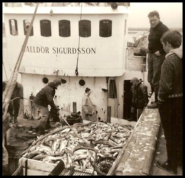 Hér er verið að landa fullfermis túr úr Jalldóri Sig. afli líka á dekki. Þarna má sjá í löndunargenginu m.a. Friðrik Jónsson, Gunna Geira og Matta, á Bryggjunni er Þórður Stjána og strákurinn er Steinþór á Arnastöðum.