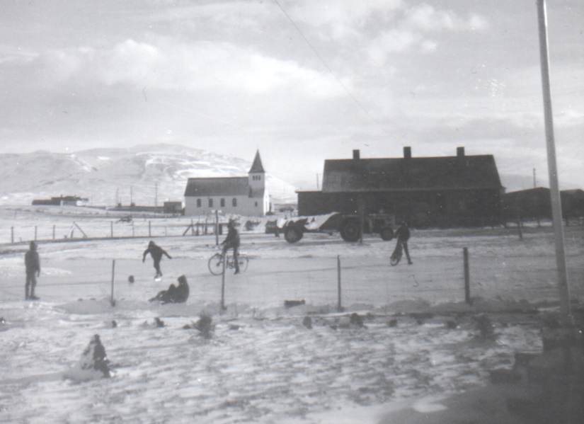 Hanna Kristín Pétursdóttir sendi inn sögu. Áður en kennarabústaðirnir voru byggðir kom svell þarna flesta vetur. Ekki alltaf það slétt að gaman væri að renna sér, - á sleðum, hjólum eða skautim.Margir áttu skauta og það var skipst á. Og leikið sér fram í svarta myrkur. Rafn Sveinsson sendi inn sögu. Það gerðist oft undir vorið að það kæmu hlákur svo það myndaðist vatn sem síðan fraus og urðu þá til góð skautasvell, á þessu svæði voru bestu svæðin á túninu sem kennt var við Jóa Páls sem var þar sem fótboltavöllurinn kom síðar, ég reyndi mig nokkuð á skautum á því svæði en varð aldrei mikill listdandari enda mín skautasaga stutt, Lilli hafði eignast ótennta skauta sem voru fastir við skautaskó sem voru of litlir á hann og naut ég góðs af því, Pabbi gaf mér síðan tennta skauta sem fengust í kaupfélaginu en kaupfélagið seldi ekki skó fyrir skautana svo ég reyndi að binda þá duglega á gúmýstígvélin sem dugði aldrei til að halda þeim föstum og dalaði þar með skauta áhuginn, síðan þegar voraði meira og hlákan hafði brætt snjóinn með blásandi sunnan átt og velgju þá breittist svæðið í stór stöðuvötn sér í lagi svæðið á móts við Höfðaborg þar sem var grasvöllur, allt affallsvatn þurfti að komast út um ræsið ofan við Lindarbrekku, til að geta viðhaldið góðum tjörnum til að sigla bátunum okkar á þá var brugðið á það ráð að loka fyrir ræsið, fylltist þá allt af vatni svo það rann yfir veginn við Austurgötu og fór þá vatn inn í kjellarann hjá Pétri Tavsen, þá varð eitthvert uppistand og ræsið opnað aftur, held að flestir hafi lært af þessarri tilraun til að stjórna náttúrunni í stað þess að njóta, þessar myndir eru líklega teknar snemma vors nálægt 1965.