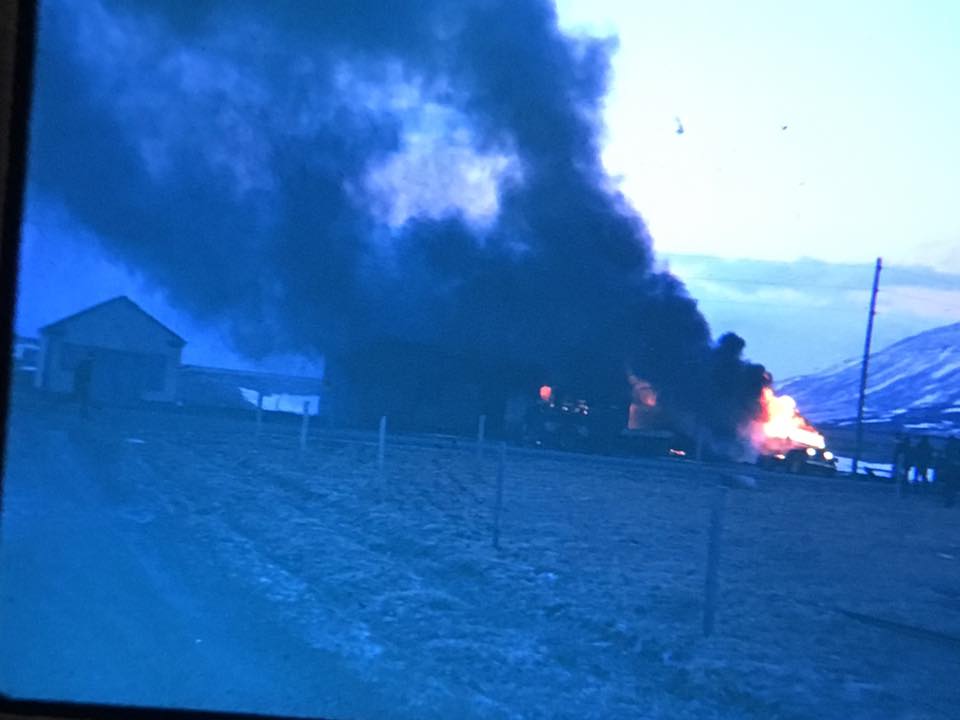 Hér má sjá bíla og vélaverkstæðið Manna brenna, þetta er sennilega stæðsti bruninn í þorpinu, að vísu brann gamli barnaskólinn.