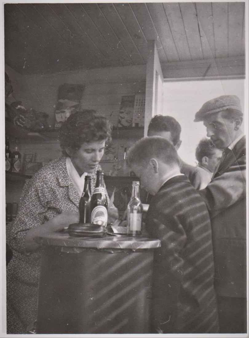 Þessi mynd er ein af svo mörgum gullmolum á þessari síðu, Alda innanvið afgreiðsluborðið í Shéll sjoppunni, Alda er að afgreiða einn pjakkinn frá Sælandi, þetta er vangasvipurinn á Bjössa, ef ekki verð ég vonandi leiðréttur í ummælum, sá sem er á bak við hann er sennilega Beii í Lyngholti, þessi sem er með derhúfuna er Óli Láru, einn af svo mörgum snillingum sem settu svip sinn á þorpið.