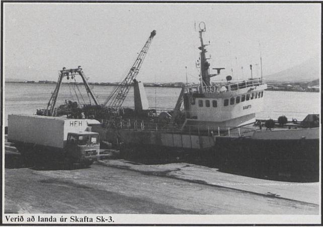 Þetta fer að verða gamalt, landað með víra bómukrana, en samt er Beii í Lyngholti hættur að keyra fiska á milli staða á gamla Chervolettinum þegar þessi mynd er tekin. Hérna verður að koma ein af mörgum gullkornum sem Jónas Tobbu missti út úr sér, sagan gerðist um borð í Skafta og Jónas var kokkur, mikil bræla var og þeir sem hafa róðið á Skafta vita að togarinn valt mjög mikið, Jónas er að bera matarpottana inn í borðsal og rétt nær að henda potti á borðið þega Skafti þekur heljarinnar veltu, Jónasi varð til happs að fatasnagi var á veggnum rétt innan við dyrnar og grípur með báðum höndum um snagann og fæturnin á kokknum verða láréttar í loftinu þar sem dallurinn var kominn á hliðina þá segir Jónas þessi fleygu orð Það fer enginn framm úr Skaft þar sem þröngt er.