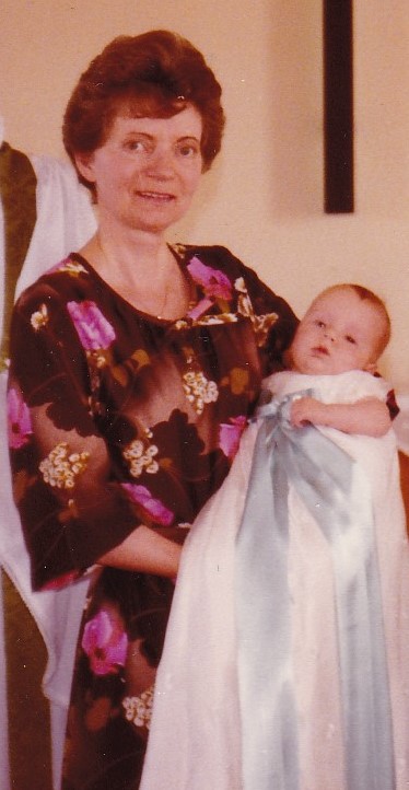 Hér sjáum við Guðrúnu Vilhjálmsdóttir Prestfrú með 1. barnabarn þeirra hjóna, barnið er Þosteinn Páll Vilhjálmsson myndin er teki 1980
