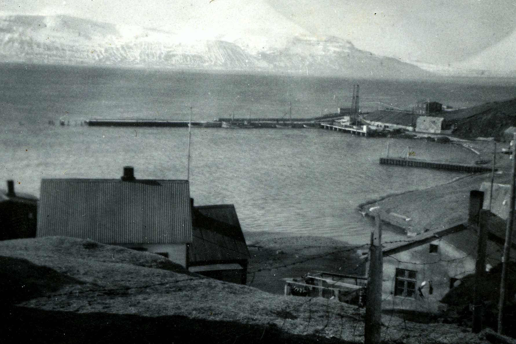Þetta er ein að tveimur myndum sem sína Bræðsluna sem Sveinn Jóhanns byggði á klöppunum fremst á Nöfinni, þarna virðist hún vera í byggingu en hana tók af í einu óveðrinu um vetur og skolaðist á haf út og að hluta inn í höfnina en á þeim árum var algengt að sjórinn gengi yfir Nöfina og inn í Höfnina, kraninn á planinu er vafalaust þarna vegna lengingar bryggjunar enda sjást staurar sem reknir hafa verið niður framan við bryggju endann, þarna er komin upp aðstaða hafnarverkamanna, skúrinn í krikanum og kamarinn á planhorninu, sem varð upphafið að skúra myndun á plan endanum, það stóð til að fjölskyldan í skúrnum myndi búa á efstu hæðinni í bræðslunni og átti að flytja þar inn um vorið en eftir að bræðslan fór í hafið var farið að huga að byggingu uppi á bakkanum. mynd líklega frá um 1948 til 1950.
