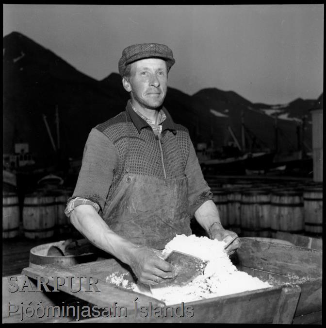 Maðurinn á myndinni er Skafti Stefánsson síldarsaltandi á Siglufirði, söltunarstöðin og síldarplanið hét Nöf. Skafti var frá Unadal í Hofshreppi, upp af Hofsósi og nafnið Nöf er þaðan komið. Skafti fæddist 6. mars 1894 og lést 27. júlí 1979. Þetta er skrifað um Skafta á Sarpnum. Fleyri myndir má sjá af Skafta hér á síðunni.