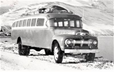 Þessi er teki þegar Búddi var að flytja fólk á síldarvertíð til Siglufjarðar Búddi undir stýri, harmonikkuleikarinn heitir Bjarni Guðmundsson Hafnfirðingur en það vantar nöfnin á síldarstúlkurnar.